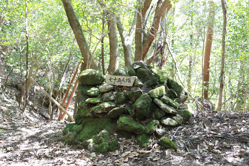 七十五人塚は、山頂から浅里方面に少し下った場所にある高さ1.3メートルの石積みの塚です。