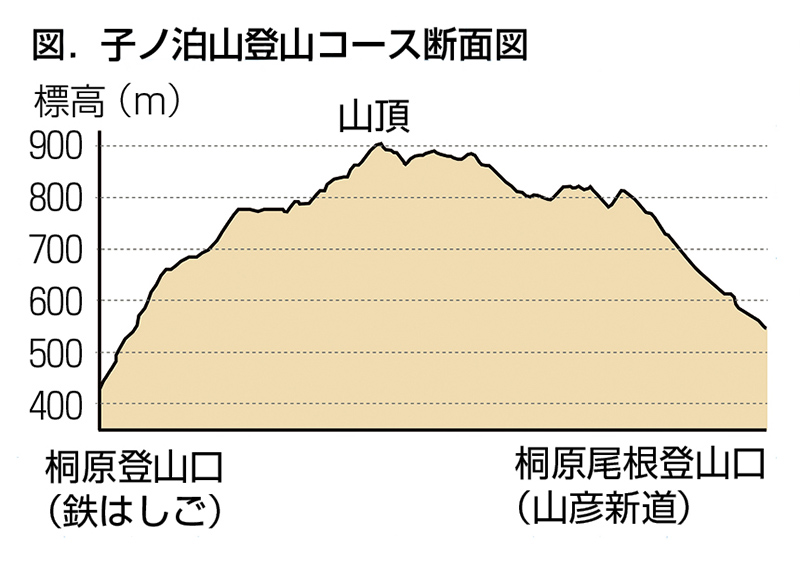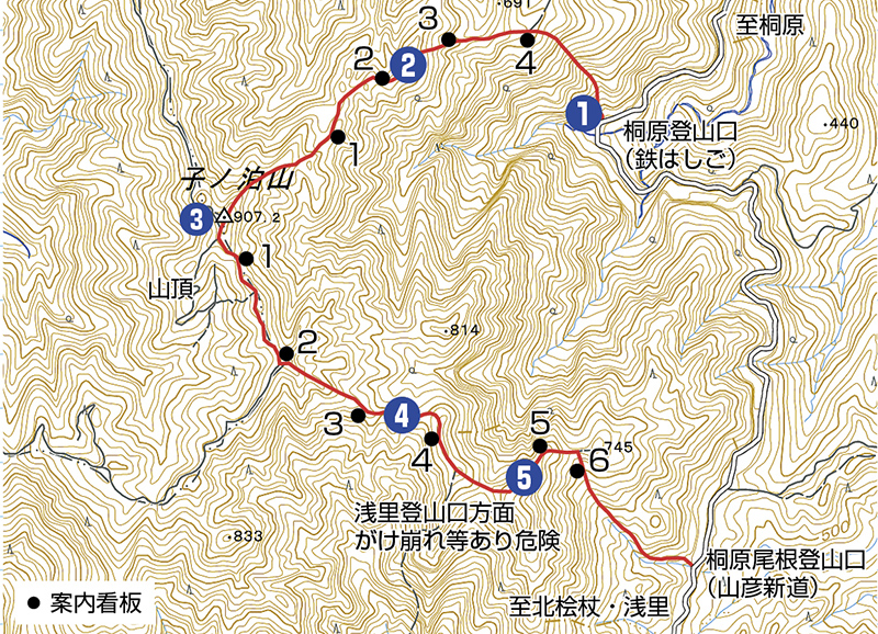 今回は、一般的なコースの桐原登山口(鉄はしご)から桐原尾根登山口( 山や まびこ彦 新道)のコースをご紹介します。所要時間は登り約2時間、下り約2時間の計約4時間の登山となります。