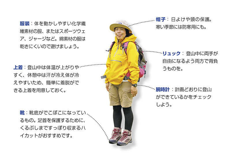 ここで紹介している装備や準備物を参考に、登る季節やそれぞれの事情に合わせて必要なものを考えて調整してください。